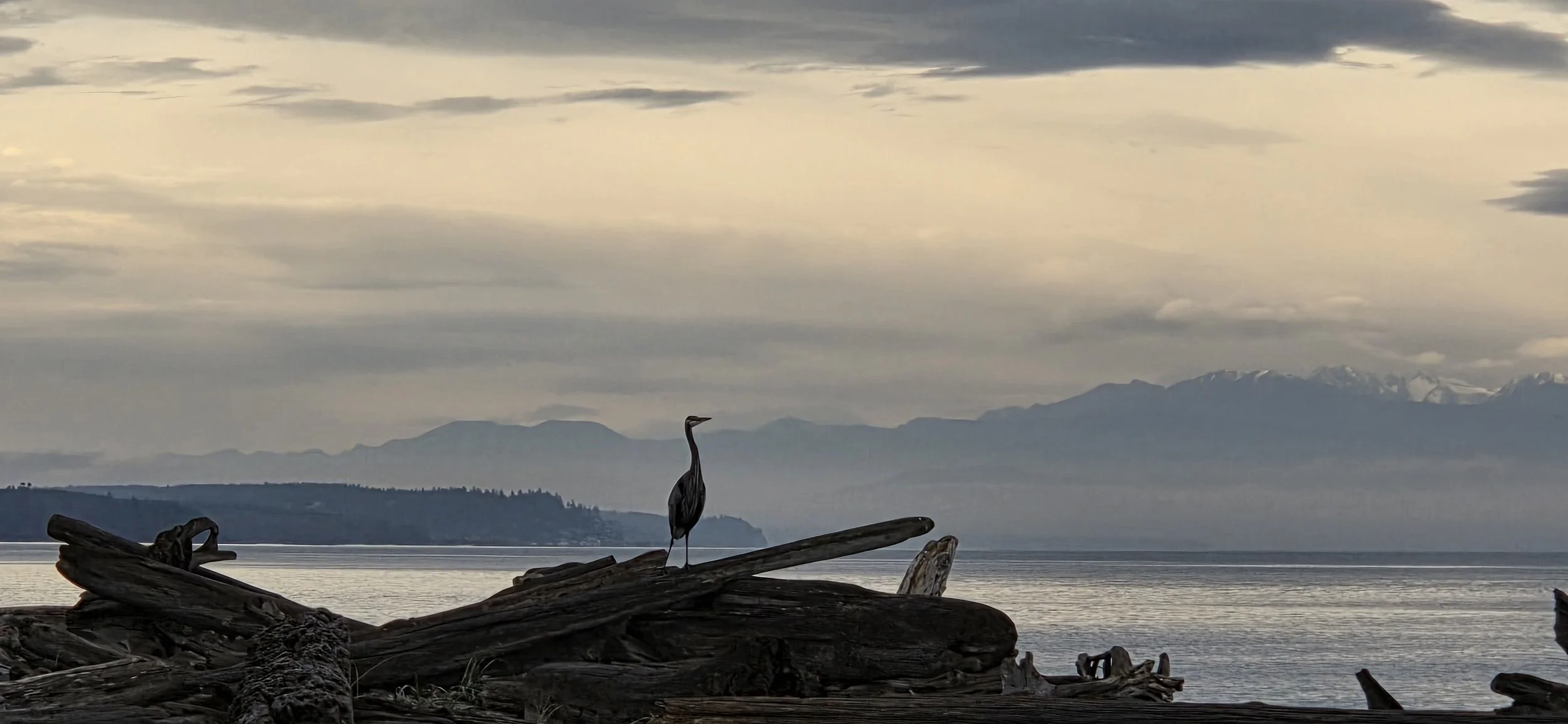 As we walked toward the forest trail, we saw a Great Blue Heron perched on driftwood with the Olympics as a backdrop. It was a memorable sight.