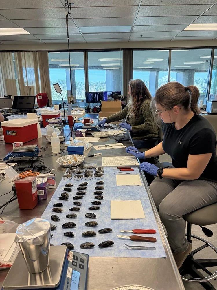 Figure 3: Preparing retrieved mussels for chemical analysis at WDFW's marine laboratory in Olympia Washington.