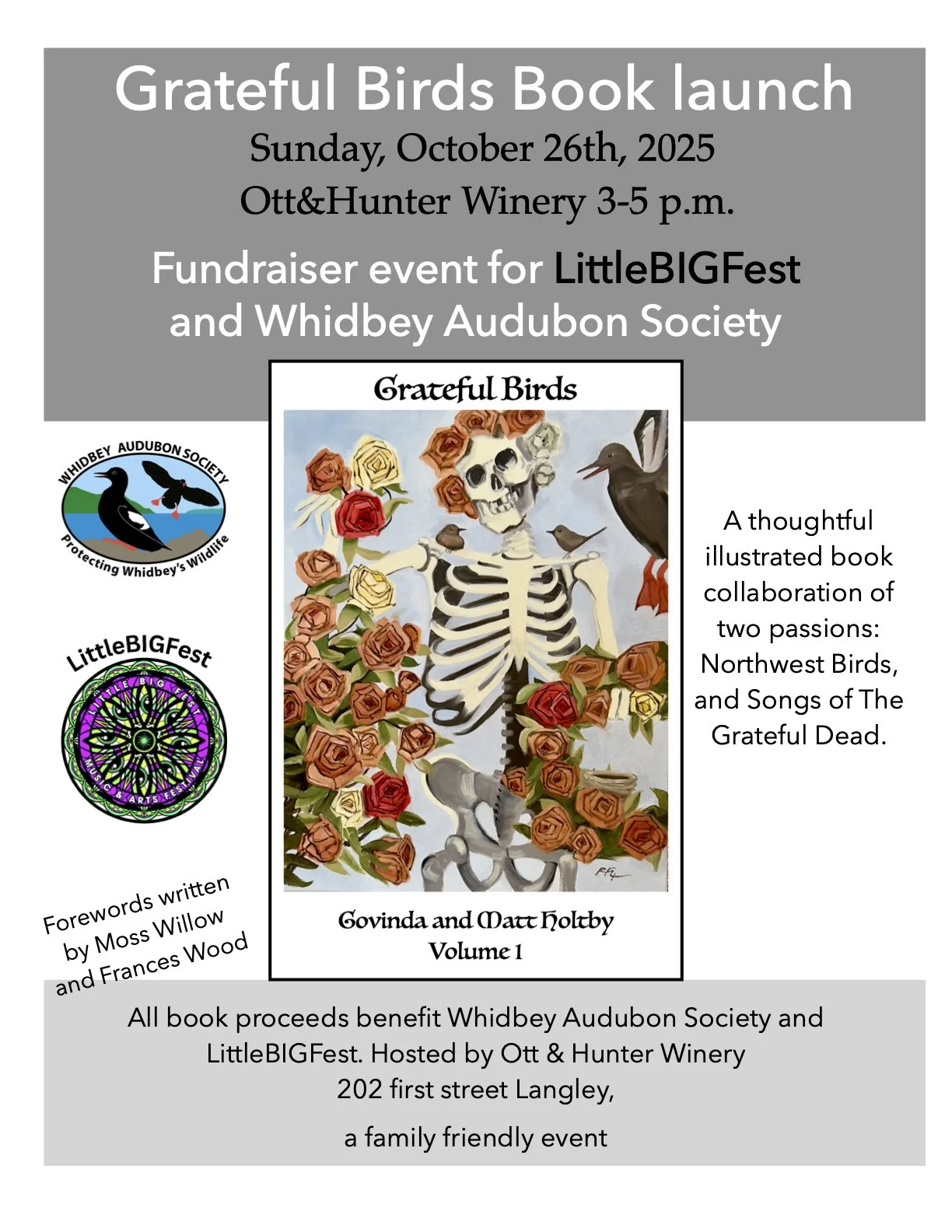 Longtime South Whidbey Audubon member Govinda Holtby and her husband, Matt, a follower of the Grateful Dead, have published a book that melds their two passions: Northwest birds and the Grateful Dead. They will be launching the book with a festive, public celebration at Ott & Hunter winery in Langley on October 26, 3 - 5 p.m.