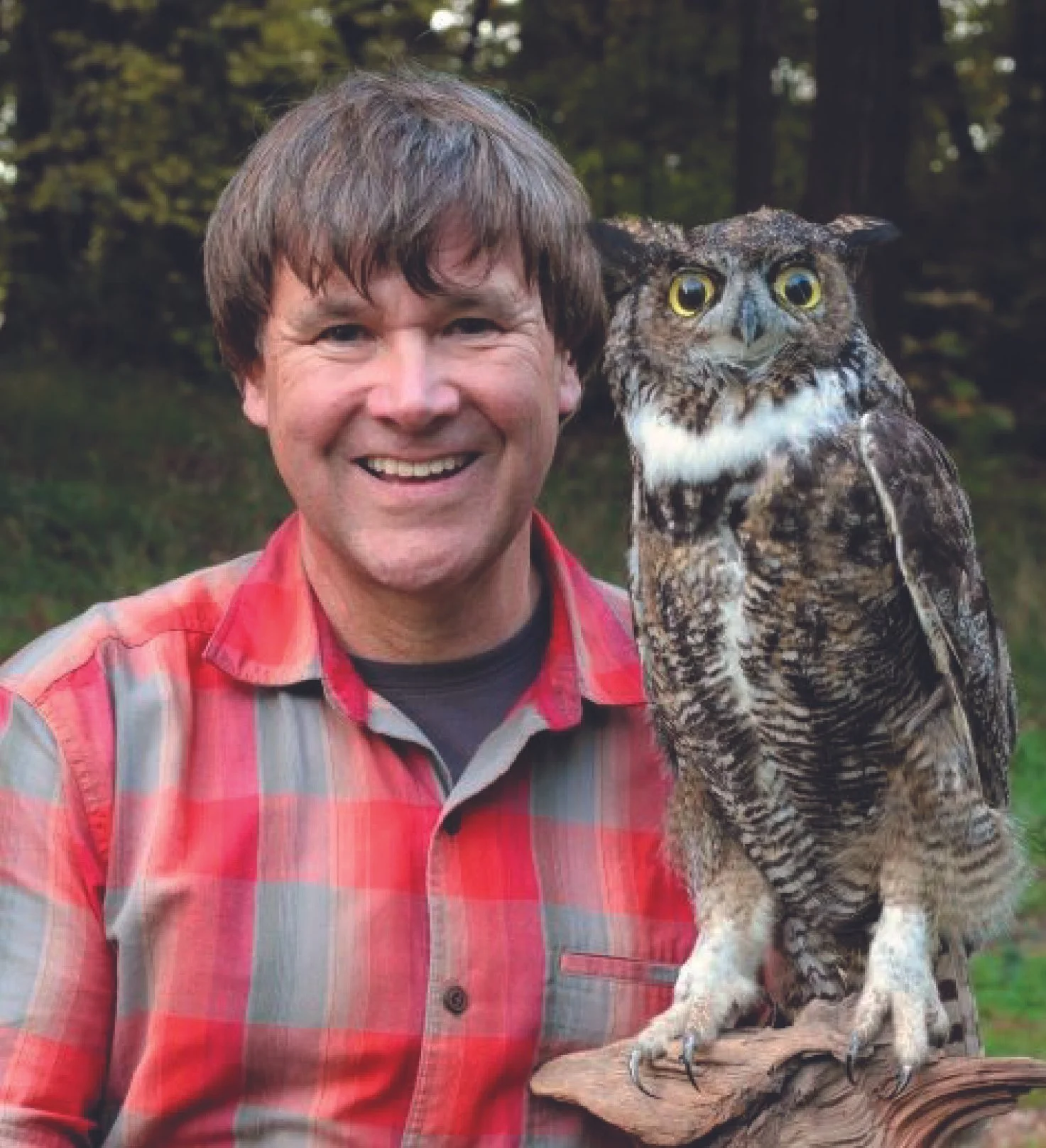 Ed Dominquez, lead naturalist at Seward Park Audubon Center, with a Great Horned Owl.