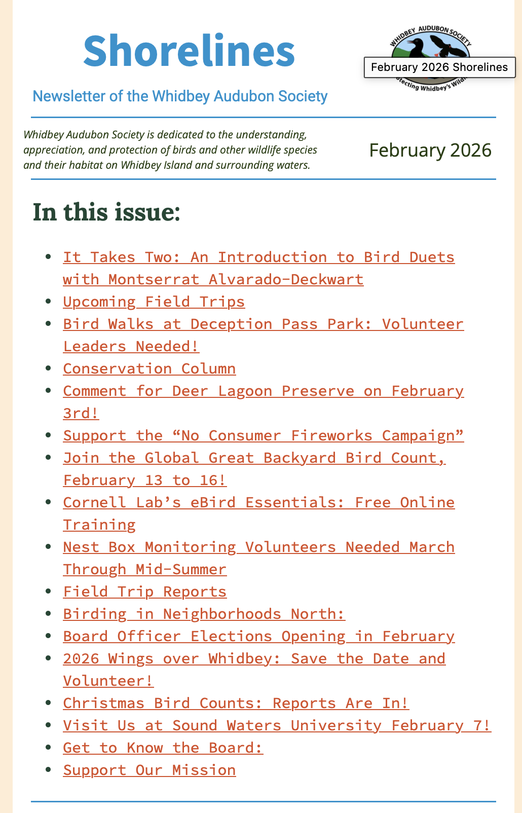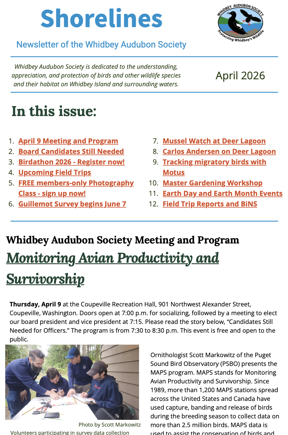 Shorelines is our newsletter, published nine times a year. It’s your resource for finding out about upcoming Whidbey Audubon events, field trips, recent sightings, articles of interest, and our monthly speaker.